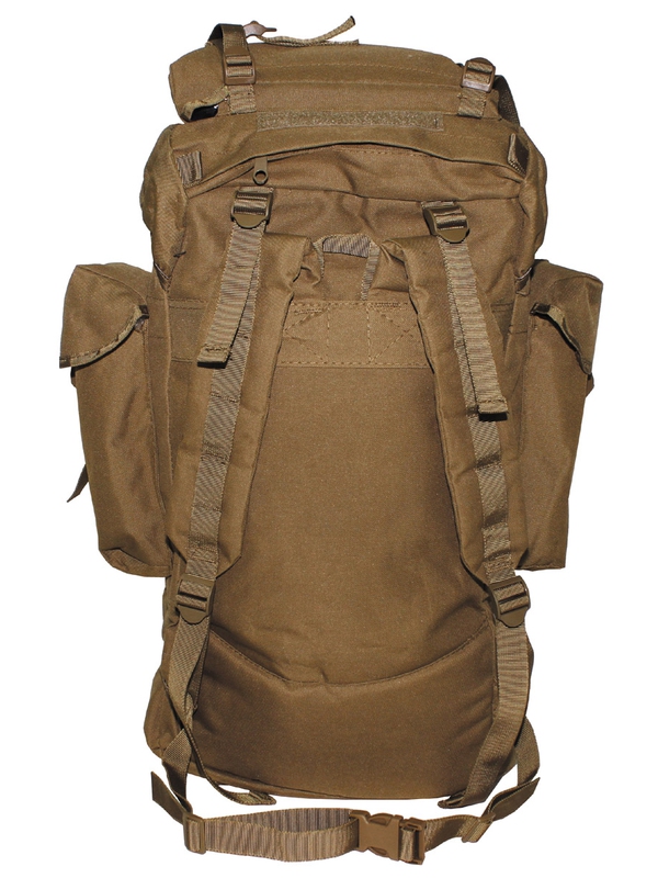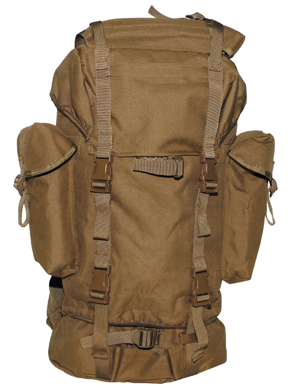 Vysoký bojový ruksak vo farebnom dizajne coyote tan s hliníkovou výstuhou, polstrované chrbtové popruhy, dve vnútorné vrecká, dve veľké postranné vrecká, veľká samostatná priehradka v spodnej časti a veko s vreckom na suchý zips a pripojený ďalšie vrece, upínacie pásy na prednej strane, dno a veko, šikovné plastové spony do 65 litrov, materiál: 100% polyester. | ||