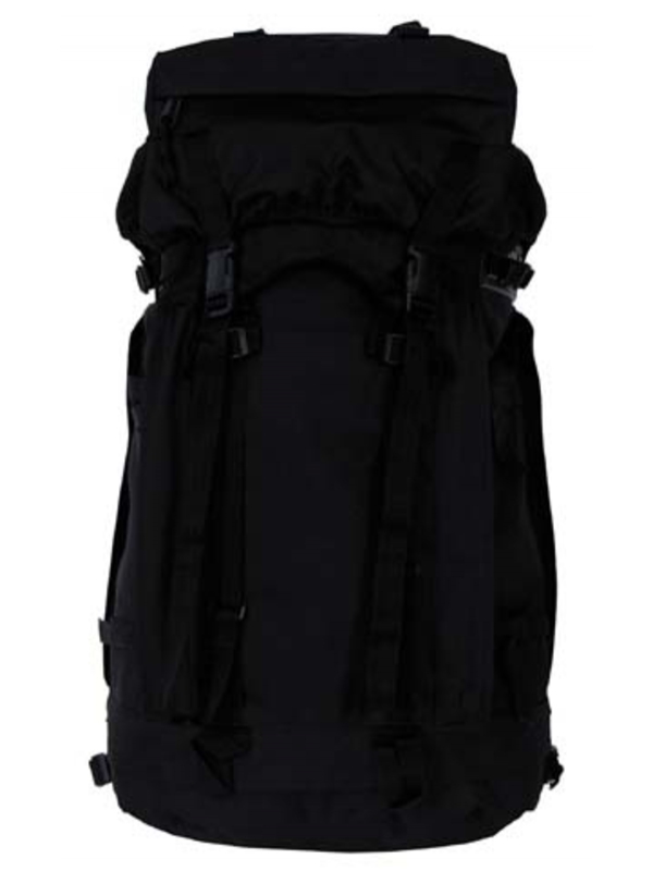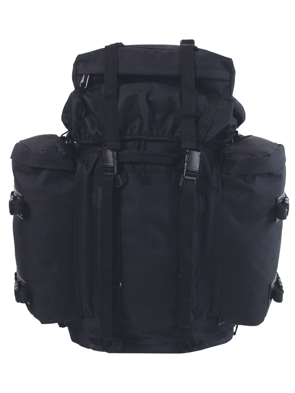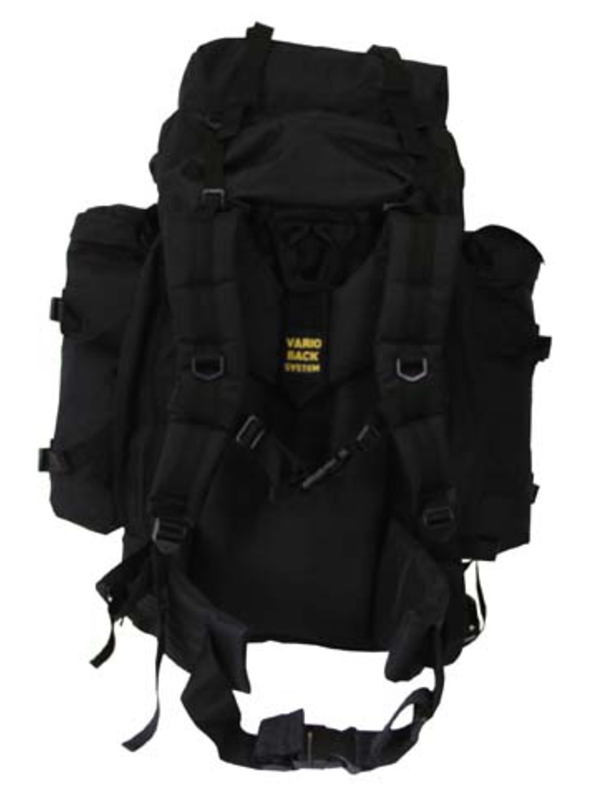 BW batoh "Mountain", v čiernej farbe, má dve odnímateľné bočné vrecká možné použiť následne ako batôžtek, v spodnej časti priestor na uloženie špinavého oblečenia, bedrový pás a chrbát sú polstrovaná a nastaviteľný polstrovaný ramenný popruh-VARIO-BACK SYSTEM. Hore je priestor uzavretý na zips a kompresné popruhy, rôzne slučky na bočné vrecká, hrudný popruh, v zadnej časti je integrovaný kovový rám, kapacita asi 80 l, materiál: 100% polyester, veľkosť: 38 x 22 batoh x 70 cm, bočné vrecká 20 x 10 x 40 cm.