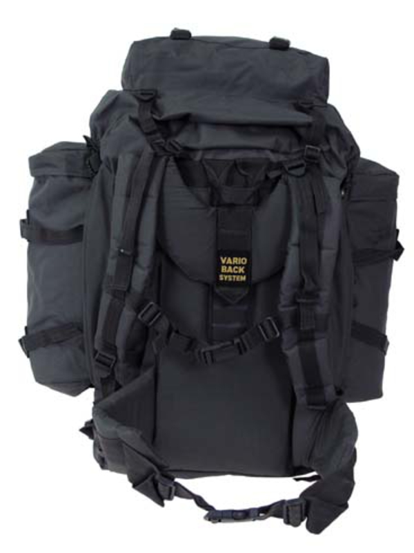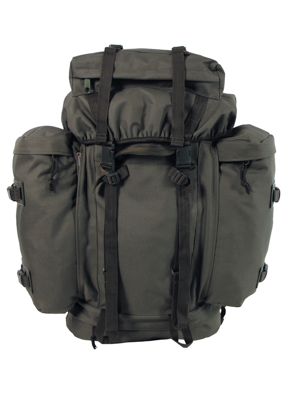 BW batoh "Mountain", v olivovej farbe, má dve odnímateľné bočné vrecká možné použiť následne ako batôžtek, v spodnej časti priestor na uloženie špinavého oblečenia, bedrový pás a chrbát sú polstrovaná a nastaviteľný polstrovaný ramenný popruh-VARIO-BACK SYSTEM. Hore je priestor uzavretý na zips a kompresné popruhy, rôzne slučky na bočné vrecká, hrudný popruh, v zadnej časti je integrovaný kovový rám, kapacita asi 80 l, materiál: 100% polyester, veľkosť: 38 x 22 batoh x 70 cm, bočné vrecká 20 x 10 x 40 cm.