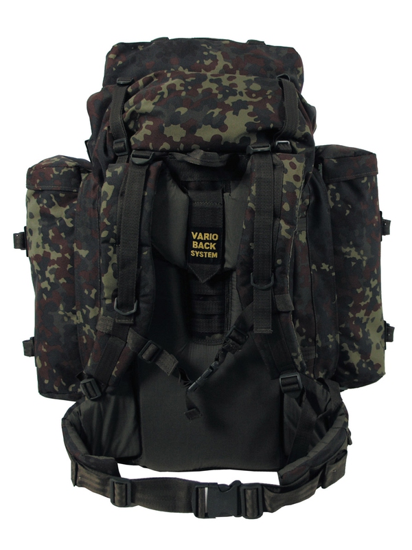 BW batoh "Mountain", v dizajne flecktarn, má dve odnímateľné bočné vrecká možné použiť následne ako batôžtek, v spodnej časti priestor na uloženie špinavého oblečenia, bedrový pás a chrbát sú polstrovaná a nastaviteľný polstrovaný ramenný popruh-VARIO-BACK SYSTEM. Hore je priestor uzavretý na zips a kompresné popruhy, rôzne slučky na bočné vrecká, hrudný popruh, v zadnej časti je integrovaný kovový rám, kapacita asi 80 l, materiál: 100% polyester, veľkosť: 38 x 22 batoh x 70 cm, bočné vrecká 20 x 10 x 40 cm.