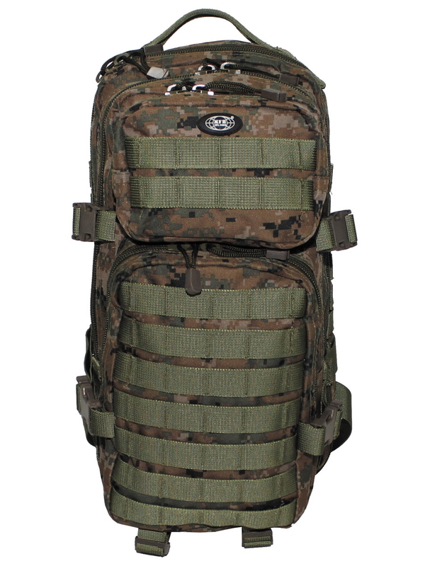 US batoh ASSAULT I, v designe digital woodland. "Malá poľná" je vodeodolný batoh na 30 l balení útoku, má dva veľké priestory s rôznymi zipi a sieťovinami vnútri a dve malé predné vrecká, vstavanou vrecko na suchý zips pre vodné balení. Všetky priestory sú uzavreté robustnými dvojpásmovým zipsy. Ergonomicky tvarované ramenné popruhy sú polstrované, asi 5 cm široké s nastaviteľnou dĺžkou, okrem toho má batoh polstrovaný chrbát a nastaviteľný popruh okolo pásu s klipom. Batoh umožňuje ovládanie veľkosti a vďaka fixáciu batožiny radom bočných kompresných popruhov dáva možnosť pripojenia ďalšieho príslušenstva. Nylonové popruhy MOLLE sú všestranné vďaka slučkám a D-krúžkom. Batoh tak ponúka veľké množstvo priestoru a je tak ideálny pre vojenské účely, ale aj táborenie a turistiku. Kapacita: 30 l Materiál: 600D polyester, PVC potiahnuté, rozmery: cca. 42 x 20 x 25 cm, hmotnosť: 1100 g | ||