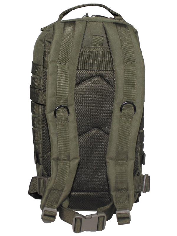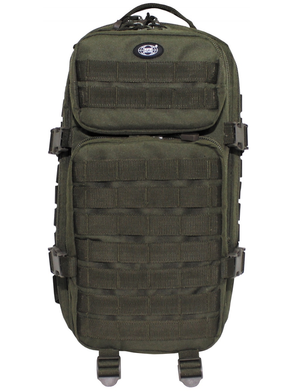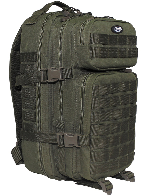 US batoh Assault I, v olivovej farbe má dve veľké hlavné priehradky na zips a sieťované vrecká, dve veľké predné vrecká na zips, nastaviteľné a polstrované ramenné popruhy s D-krúžky, vstavanou vrecko na suchý zips vrecko na hydro-batoh na chrbát, rôzne molle úchytky, držadlo, priedušný chrbát a ramenné popruhy, obsah asi 30 litrov, materiál 100% nylon, veľkosť: 45 x 25 x 20 cm.