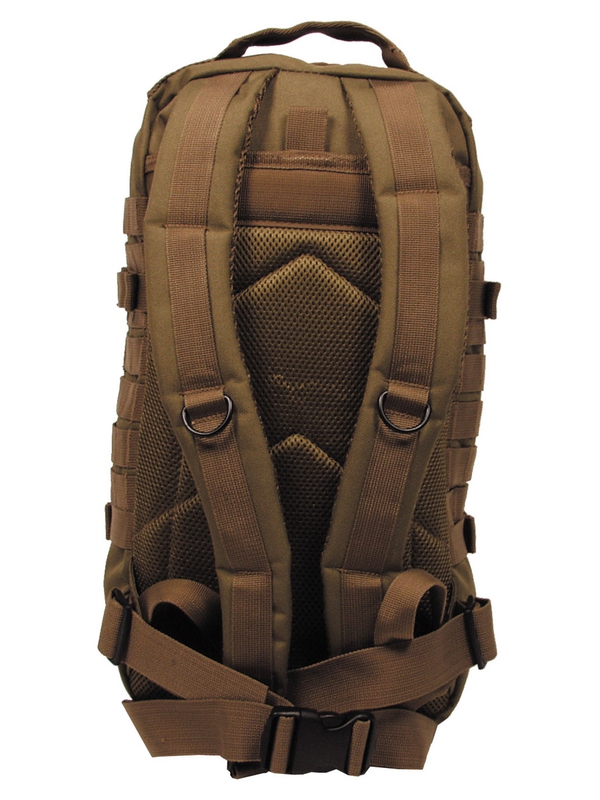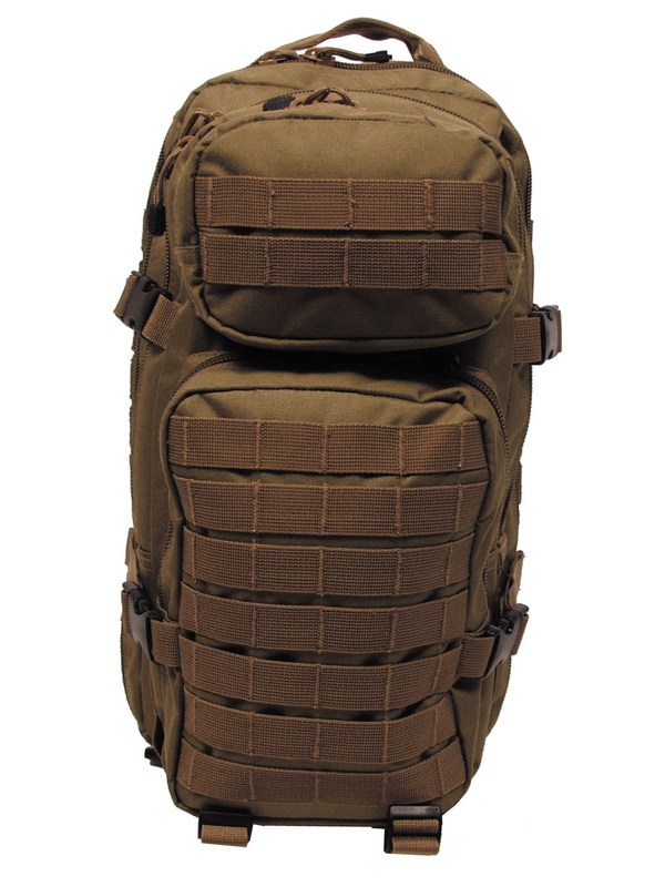 US batoh Assault I, v dizajne coyote tan, má dve veľké hlavné priehradky na zips a sieťované vrecká, dve veľké predné vrecká na zips, nastaviteľné a polstrované ramenné popruhy s D-krúžky, vstavanou vrecko na suchý zips vrecko na hydro-batoh na chrbát , rôzne Molle úchytky, držadlo, priedušný chrbát a ramenné popruhy, obsah asi 30 litrov, materiál 100% nylon, veľkosť: 45 x 25 x 20 cm.
