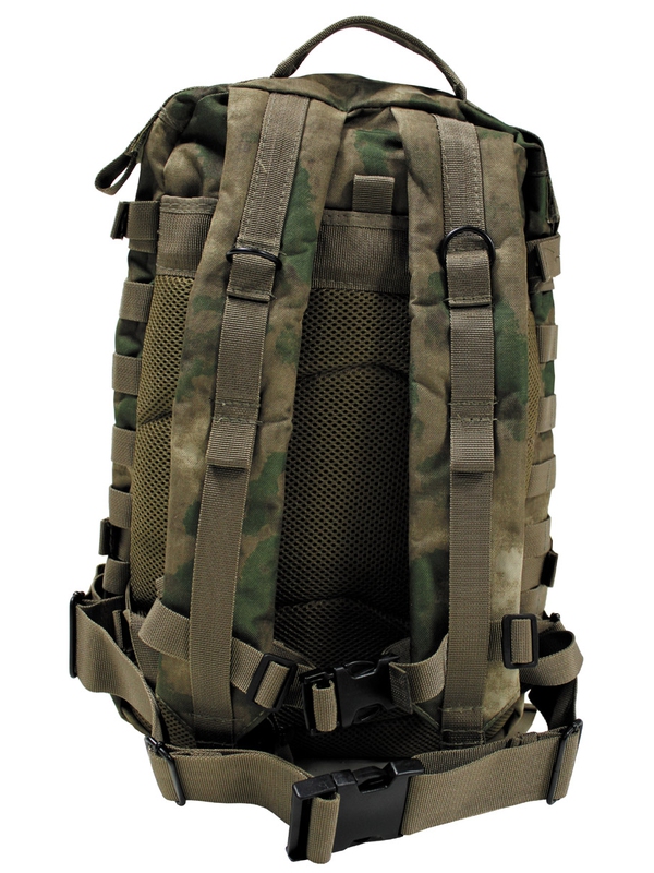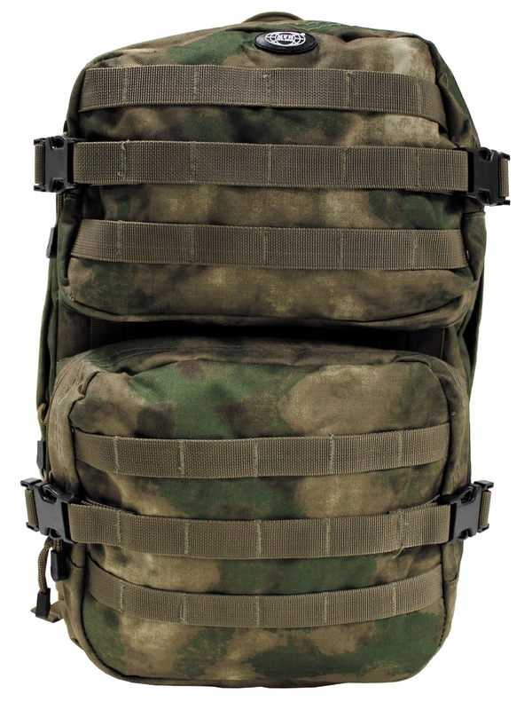 US batoh, Assault II, HDT camo FG, veľká hlavná priehradka na zips a vrecko zo sieťoviny, 2 veľké predné vrecká na zips, polstrované a nastaviteľné ramenné popruhy s D-krúžkami, vstavanou vrecko na suchý zips pre hydro packom na chrbte, rôzne pripojovacie body Molle, nastaviteľný brušný pás odnímateľné držadlo, veľkosť: Batoh 48 x 30 x 30 cm, 100% polyester | ||