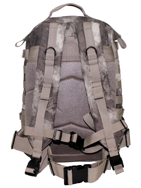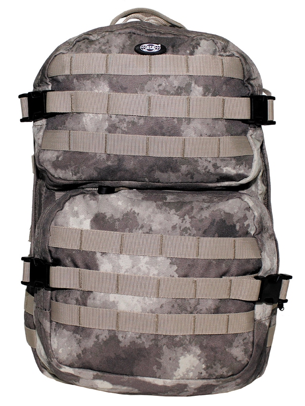 Batoh má veľkú hlavnú priehradku na zips a sieťované vrecko, dve veľké predné vrecká na zips, polstrované a nastaviteľné ramenné popruhy s D-krúžkami, vstavanou vreckom na suchý zips pre balenie hydro na zadnej strane, rôzne Molle pripojovacie body, nastaviteľný brušný pás, odnímateľné držadlo, Veľkosť: batoh 48 x 30 x 30 cm, materiál: 100% polyester. | ||