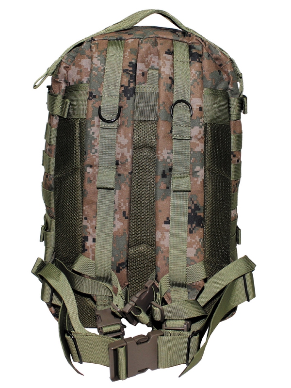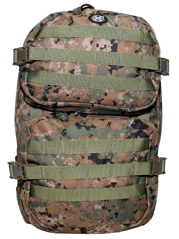 US batoh Assault II v dizajne digital woodland. Batoh má veľkú hlavnú kapsu na zips a sieťované vrecko, dve veľké predné vrecká na zips a nastaviteľné polstrované ramenné popruhy s krúžkami D-, vrecko na suchý zips integrovaná na vodnej batoh na chrbte, Molle úchytky, nastaviteľný bedrový pás a odnímateľné držadlo. Veľkosť: 48 x 30 x 30 cm, material: 100% nylon.