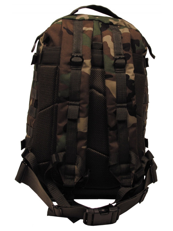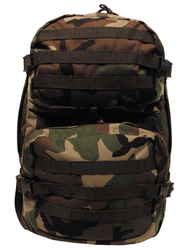 US batoh Assault II, v dizajne woodland má jednu veľkú hlavné vrecko na zips, dve veľké predné vrecká na zips, polstrované a nastaviteľné ramenné popruhy s D-krúžky, integrovanou vrecko na suchý zips na hydro-batoh na chrbát, rôzne Molle úchytky, nastaviteľný bedrový pás odnímateľné držadlo, materiál: 100% nylon, veľkosť: 48 x 30 x 30 cm.