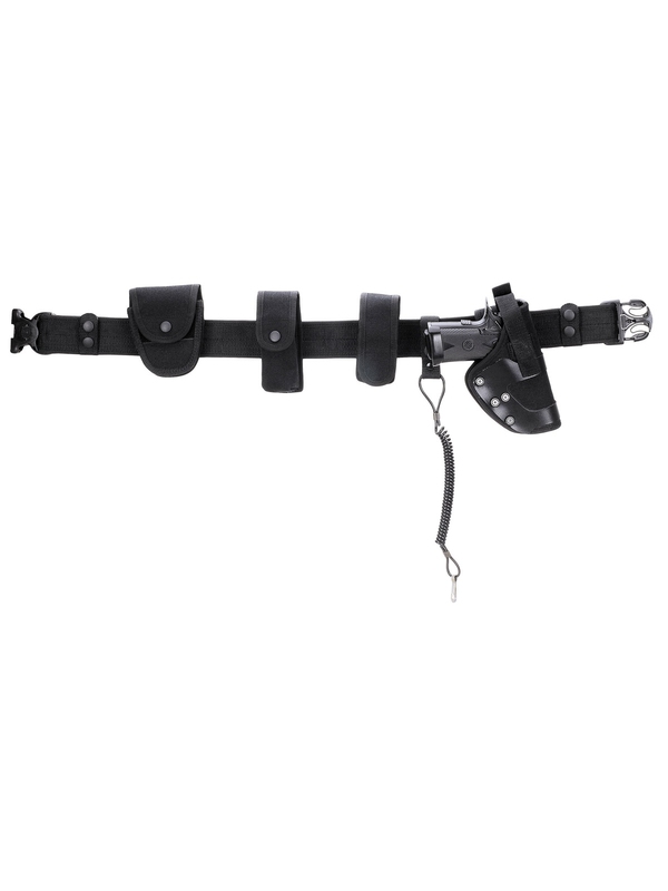 Čierny opasok "Security", osemdielny. Opasok sa hodí pre bezpečnostné služby, je možné nosiť samostatne alebo v kombinácii s taktickú vestu. Hmotnosť: 700 g Materiál: 100% Nylon 1000 D. Opasok má dve spony, púzdro na putá, puzdro pre zásobník, púzdro pre obranný sprej, univerzálny pištoľové púzdro a bezpečnostné lanko proti strate pištole.