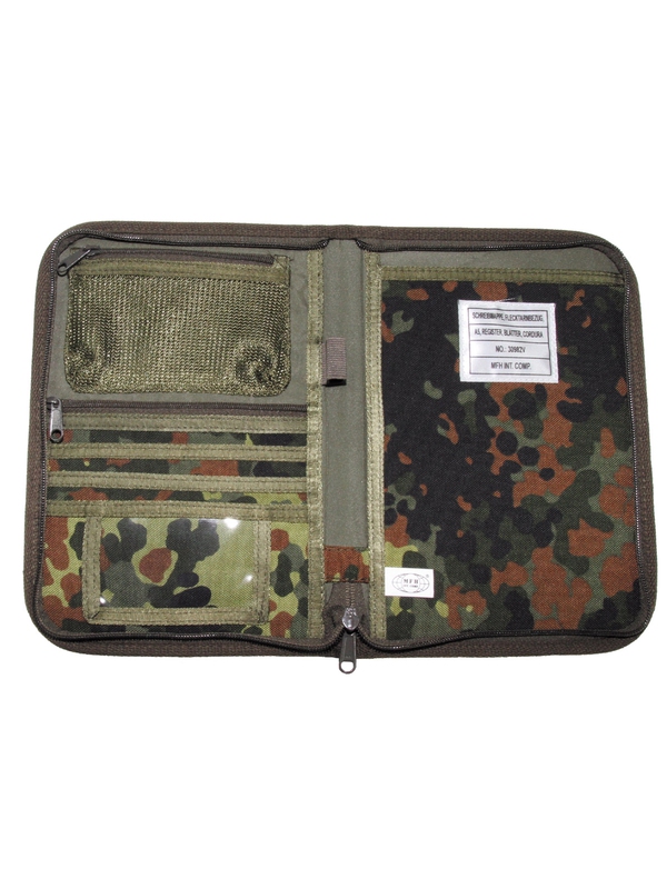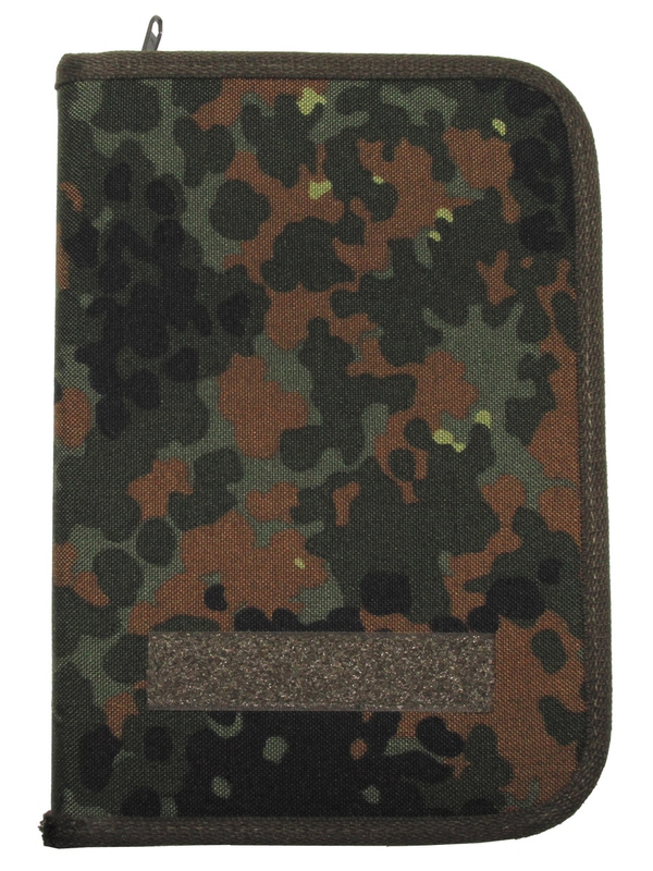 Puzdro na písacie potreby vo formáte A v dizajne flecktarn má vrecko na pero, priehradku na zips na napájací adaptér, päť vnútorných vreciek a vrecko na podložku vo vnútri, na vonkajšej strane menovku na suchý zips, materiál: 100% polyamid (Cordura).