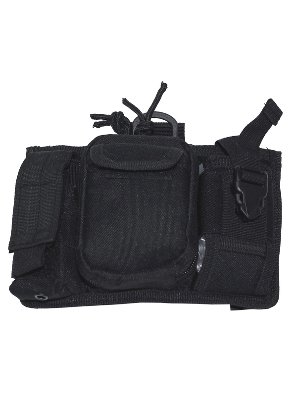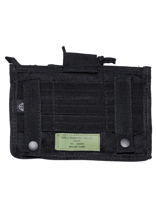 Puzdro na mobilný telefón, "MOLLE" v čiernej farbe. Vrecko je rozdelená, stredné vrecko na zips a vreckami vpredu s náplasťou na suchý zips, vrecko na suchý zips, 1 vrecko s klipom na uzavretie, 1 zadné vrecko na suchý zips, D-ring, rozmery: 20 x 14 cm (šírka x výška ), materiál: 100% polyester.