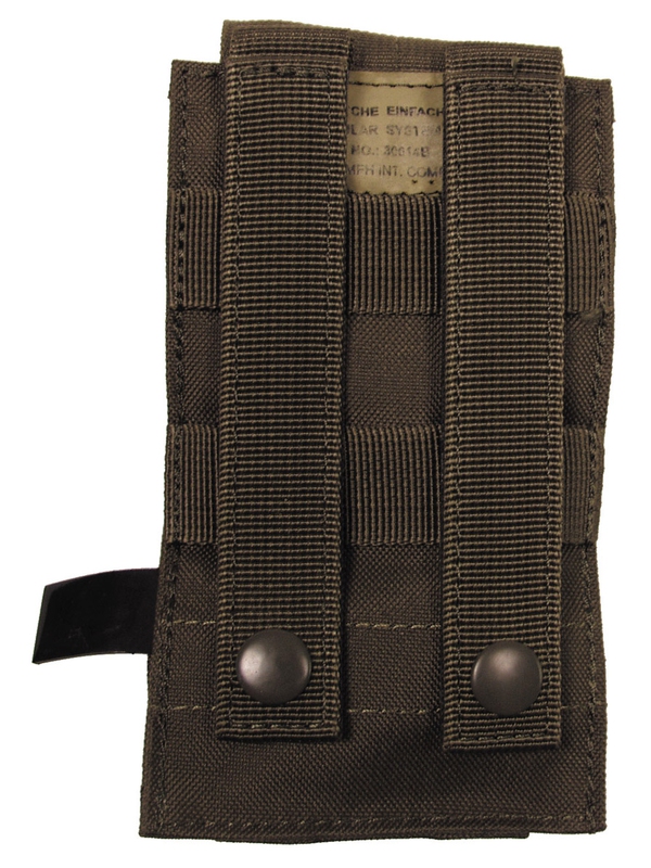 Puzdro na zásobník "MOLLE", Modular System, v olivovej farbe. MOLLE Mag puzdro so zapínaním na suchý zips je kompatibilná puzdro na zásobníky M4/M16 a ďalšie. Materiál: 100% nylon. Rozmery: šírka: 8.5 cm, hĺbka: 5 cm, výška: 16 cm. | ||