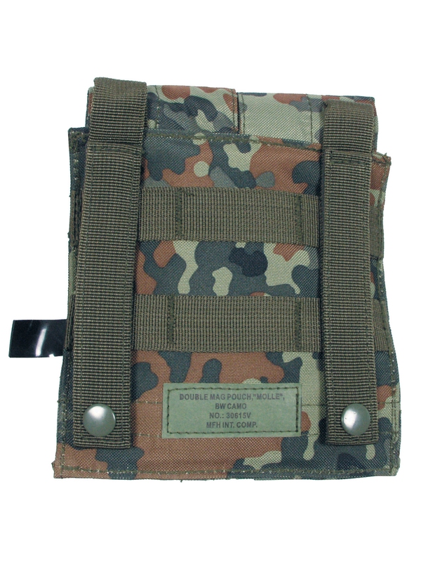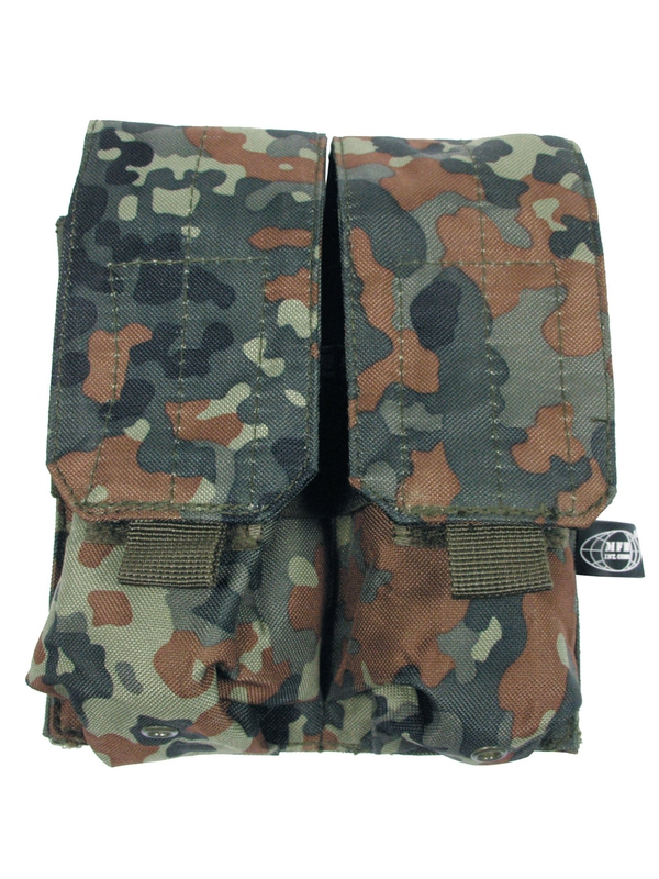 Puzdro na zásobník "MOLLE", Modular System, dvojité, design flecktarn. Dvojité púzdro na dva zásobníky na suchý zips. Veľkosť: šírka: 8,5 cm, hĺbka: 5 cm, výška: 17 cm, materiál: 100% nylon.