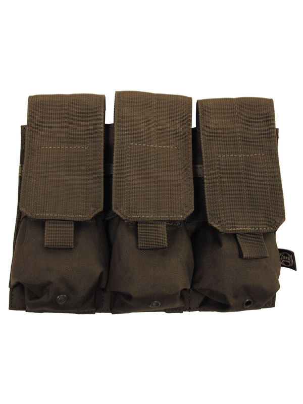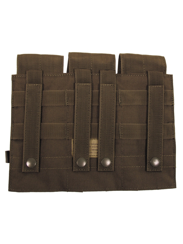 Trojité puzdro na zásobník "MOLLE" modulárny systém, v olivovej farbe, tri vrecká na suchý zips, veľkosť: šírka: 8,5 cm, hĺbka: 5 cm, výška: 17 cm, materiál: 100% polyester. | ||