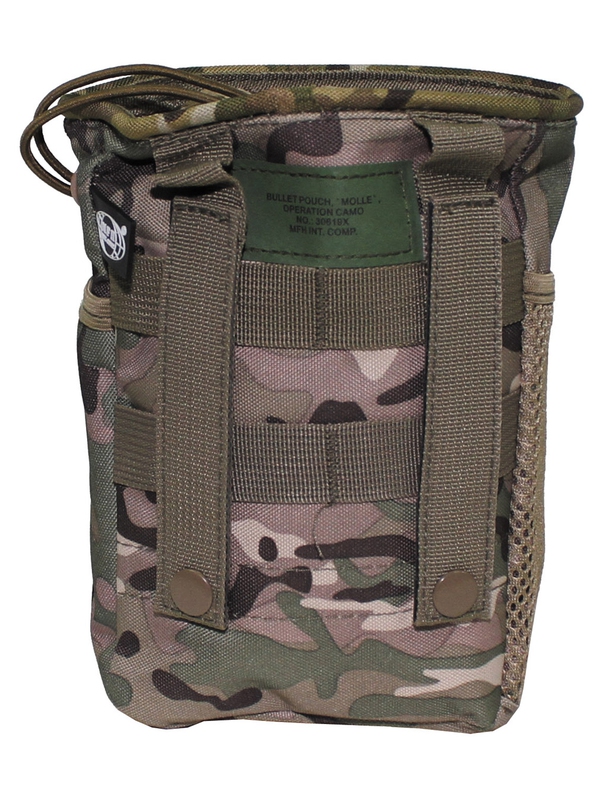 Sumka MOLLE na patróny v dizajne operačný camo, hlavné vrecko sa uzatvára špagátom, menšie predné vrecko na suchý zips, dve malé bočné vrecká, rozmery: šírka: 14cm, hĺbka: 8cm, výška: 20cm, materiál: 100% nylon. | ||