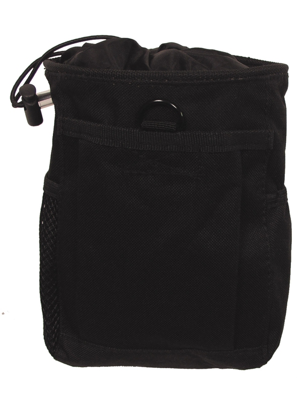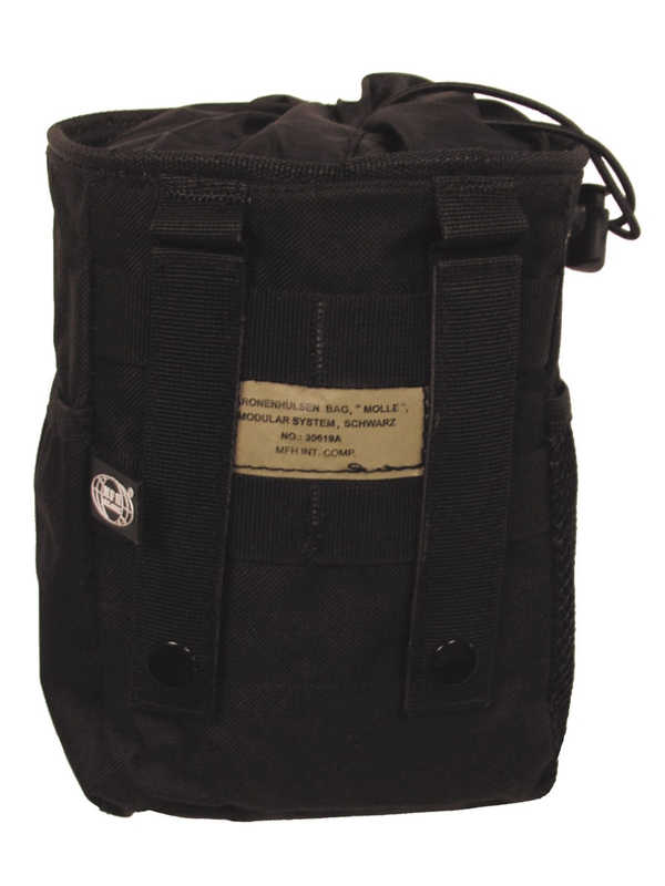 Čierne vrecko na nábojnice, "MOLLE" Modulárny systém, vonkajšie predné vrecko na suchý zips a slučku, dve malé bočné vrecká, sťahovací uzáver. Rozmery: šírka: 14 cm, hĺbka: 8 cm, výška: 20 cm, materiál: 100% polyester. | ||