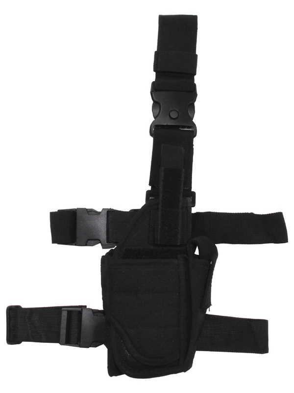 Univerzálne nízke puzdro na pištoľ na nohu, pravé, v čiernej farbe je vhodné pre všetky populárne zbrane a individuálne veľkosti na suchý zips, zabezpečenie zbraní v opasku na suchý zips. Puzdro s uzáverom na suchý zips, nastaviteľný opasok s prackou a 2 nastaviteľné nožné popruhy, materiál: 100% polyester.