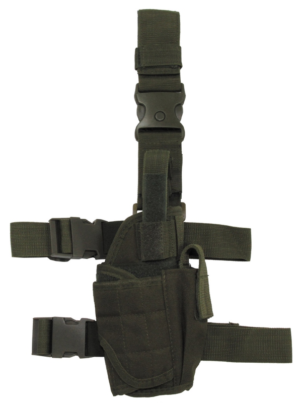 Univerzálne nízke puzdro na pištoľ na nohu, pravé, v olivovej farbe, je vhodné pre všetky populárne zbrane a individuálne veľkosti na suchý zips, zabezpečenie zbraní v opasku na suchý zips. Puzdro s uzáverom na suchý zips, nastaviteľný opasok s prackou a 2 nastaviteľné nožné popruhy, materiál: 100% polyester.