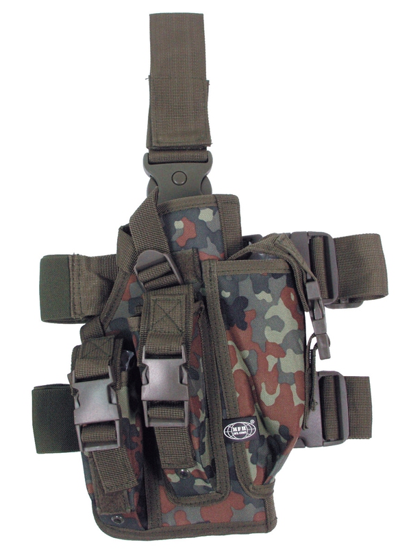Špičkové, veľmi kvalitné a oderuodolné puzdro na pištoľ, vyrobené podľa požiadaviek špeciálnych jednotiek, pravé, v dizajne flectarn. Puzdro má 3 kapsičky na zásobník a je vhodné pre všetky typy zbraní. Puzdro sa upevňuje pomocou dvoch nylonových popruhov k opasku a na nohe. Odepíná sa plastovými sponami. Rozmery: 25 cm x 16 cm x 5 cm, niektoré hlavne môžu presahovať. Materiál: 100% polyester.