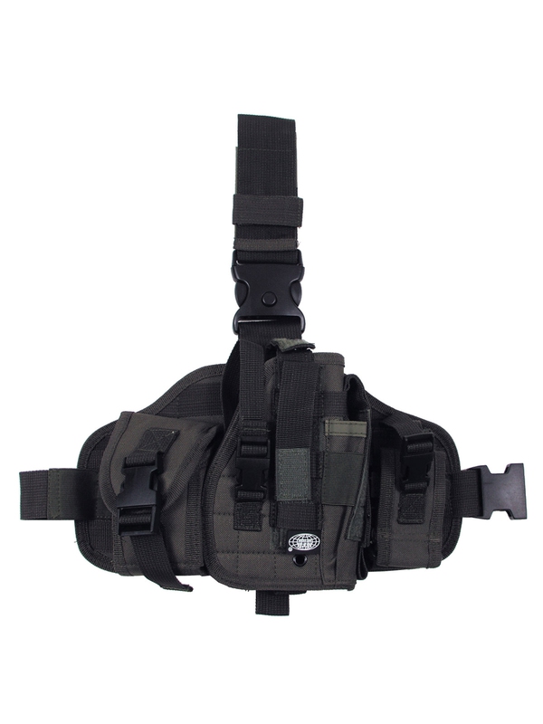 Pištoľové púzdro na nohu, olivové, so sponou na opasok. Praktické stehenné púzdro s PVC lištou vzadu, s vreckom na zásobník, dva odnímatené univerzálne vrecká so suchým zipsom, nastaviteľný opasok. Materiál: 100% polyester. Rozmery: celkové 32 x 18cm, pištoľ 19 x 12cm, u niektorých typov môže hlaveň presahovať von.