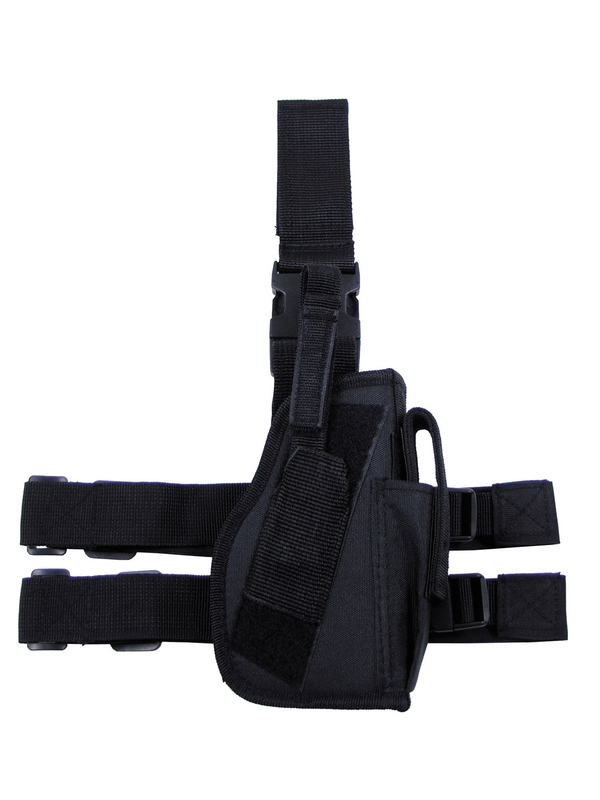Stehenné puzdro na pištoľ pravé, čierne, z odolného materiálu je vhodné pre všetky typy pištoľou. Puzdro sa upevňuje pomocou nylonových popruhov k opasku a dvoma popruhmi k nohe. Odepíná sa prostredníctvom plastových spôn. Na puzdre je vrecko pre náhradnú zásobník. Rozmery: 19 cm x 13 cm x 5 cm, u niektorých typov zbraní môže hlaveň puzdro presahovať. Materiál: 100% nylon.