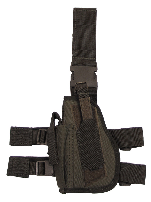 Ľavé stehenné puzdro na pištoľ z odolného materiálu v olivovej farbe, je vhodné pre všetky typy pištoľou. Upevňuje sa prostredníctvom nylonových popruhov k opasku a na nohe - 2 popruhy, odepíná sa pomocou plastových spôn. Na strane púzdra je vrecko pre náhradnú zásobník. U niektorých typov môže hlaveň puzdro presahovať. Materiál: 100% nylon.