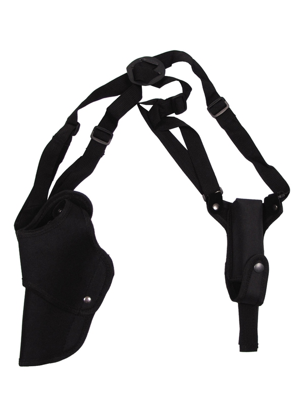 Ľavé podpažné puzdro na pištoľ v čiernej farbe je vyrobené z kvalitného odolného materiálu a je vhodné pre všetky typy pištoľou. Puzdro sa prostredníctvom nastaviteľných nylonových popruhov upevňuje krížovo k opasku a prostredníctvom suchého zipsu a cvočkov sa aj ľahko odepíná. Na boku je vrecko na náhradné zásobník so zapínaním na cvok. Materiál: 100% polyester. | ||