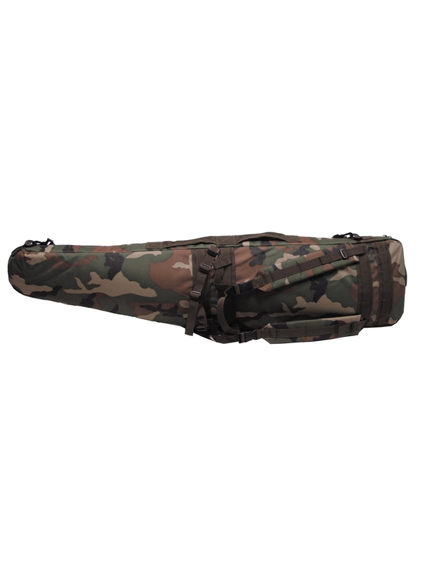 Puzdro na zbraň "Paintball", v dizajne woodland je vyrobená z veľmi kvalitného a oderuodolného silného vlákna s vložkou. Univerzálna taška s odnímateľným ramenným popruhom, ušami a odnímateľnými a nastaviteľnými ramennými popruhmi, nastaviteľným bedrovým pásom, takže sa dá nosiť aj ako batoh. Tri vonkajšie vrecká sú na suchý zips, vo vnútri tašky sú popruhy na zaistenie zbrane. Podlhovastá vrecko a hlavné zapínanie je na zips. Materiál: 100% nylon. Rozmery: dĺžka: 123 cm, šírka cca 25 cm. Puzdro je ideálne pre ochranu a skrytie zbrane.