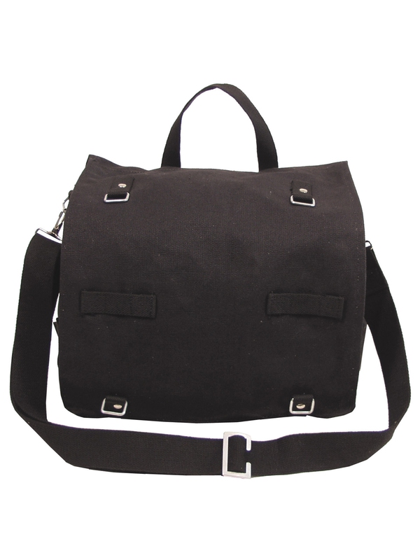 Čierna BW bojová taška. Plátená taška s nastaviteľným popruhom cez rameno, tromi vnútornými vreckami, jedno vonkajšie vrecko, ucho s nastaviteľnou dĺžkou a jedno krátke ucho, materiál: 100% bavlna, veľkosť: cca 34 x 24 x 12 cm. | ||