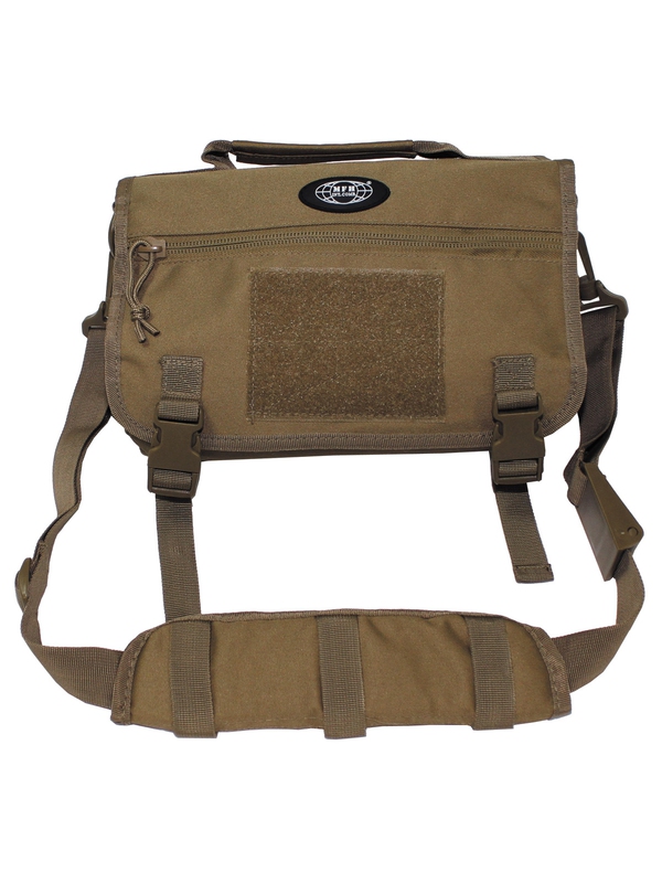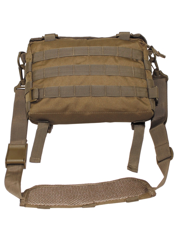 Taška cez rameno "MOLLE", malá, vo farebnom prevedení coyote tan. Taška má polstrovanú hlavné vrecko s elastickou výstužou na zachovanie tvaru, na hornej klope ucho, vrecko na zips na vonkajšej strane, lepítka 12,5 x 10 cm a transparentné vrecko na doklady 28 x 13 cm vo vnútri, odnímateľný ramenný popruh s nastaviteľnou dĺžkou as ramennými vypchávkami. Veľkosť: 28 x 19 x 6,5 cm, materiál: 100% polyester.