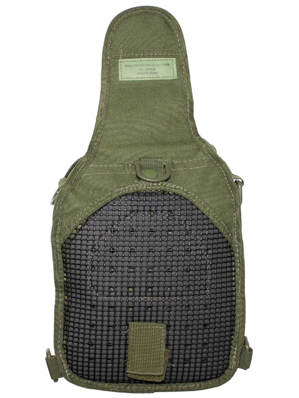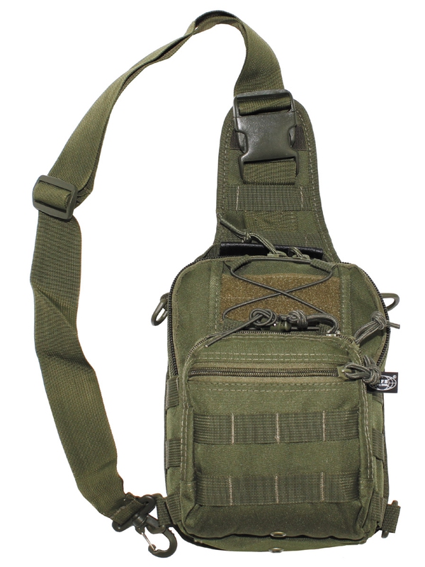 Taška cez rameno Molle, olivová. Veľká hlavná priehradka s dvoma vreckami vo vnútri, 1 predné vrecko s vnútorným vreckom, popruhom a karabínou, protišmykový povrch na zadnej časti, držadlo, nastaviteľný a odnímateľný ramenný popruh, 4 D-krúžkami, zapínanie vpredu, materiál: 100% polyester.