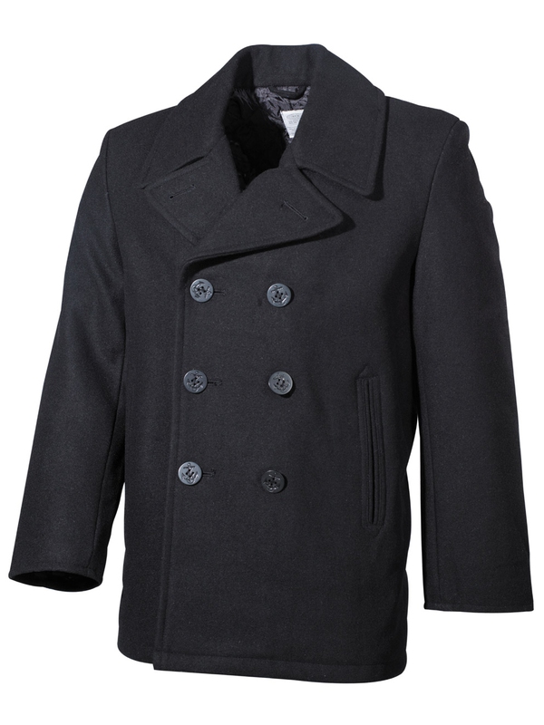 Klasický námornícky US kabát v čiernej farbe s dvojradovým zapínaním na gombíky s emblémom kotvy, má dve veľké vrecká a jedno vnútorné vrecko. Materiál: 70% vlna, 30% viskóza, prešívaná podšívka: 100% polyester.