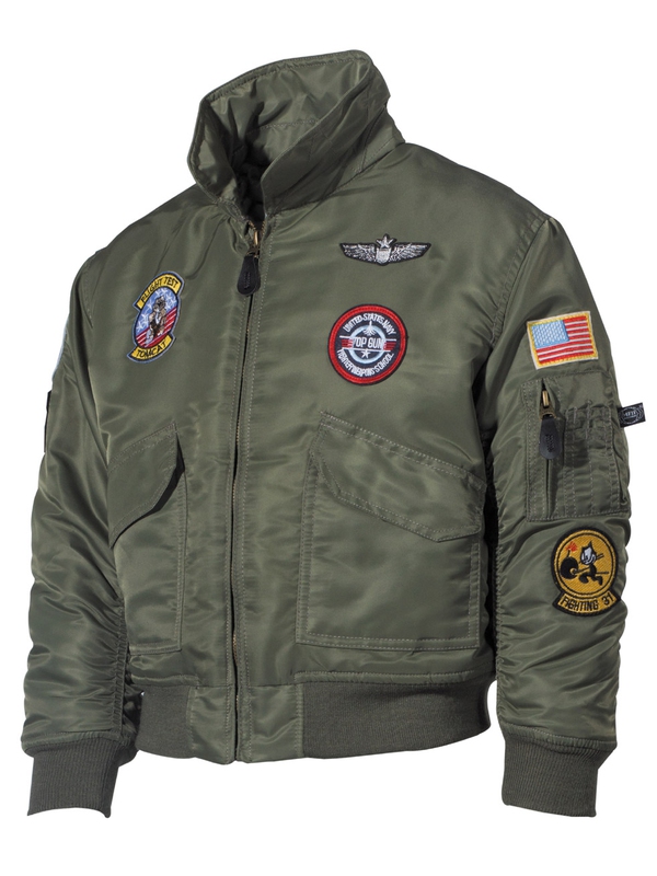 US detská pilotná bunda CWU, olivová s pilotným odznakom. Bunda s golierom má dve našité vrecká, ramenné výložky na suchý zips, pletené manžety a pas. Materiál: zvršok: 100% nylon, podšívka: 100% polyester, výplň: 100% polyester.