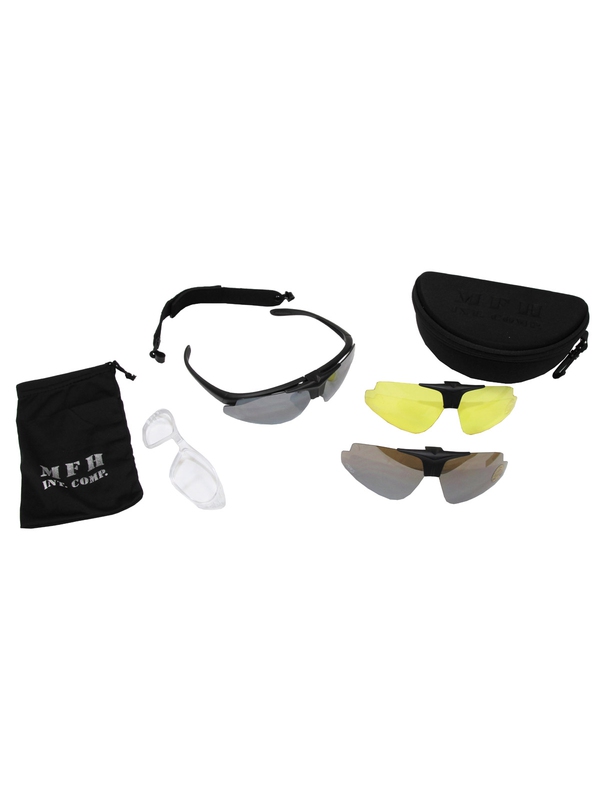 Čierne testované armádne športové okuliare HAWK s náhradnými farebnými sklami, popruhom, textilnom obalom a puzdrom. | ||