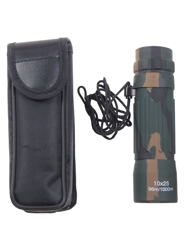 Praktický monodalekohled umožní desaťnásobné zväčšenie pri priemere objektívu: 25 mm. Zorné pole: 96 m do 1000 m, dioptrická korekcia jemná, hmotnosť: 82 g Praktický ďalekohľad v pogumované dizajne woodland, má šnúrku na krk a skladné nylonové puzdro na opasok.
