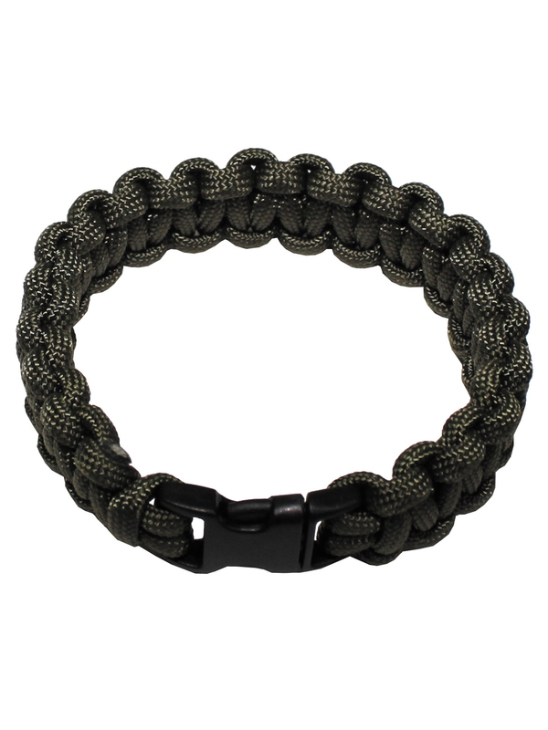Profesionálny náramok na ruku z pletené paracord - "Paracord" v olivovej farbe, šírka 1,9 cm s klipom na uzatvorenie. Veľkosti: S = 18 cm, L = 20 cm, L = 22 cm, dĺžka otvorené: S = 280 cm, L = 300 cm, L = 330 cm. Materiál: 100% polyester. | ||