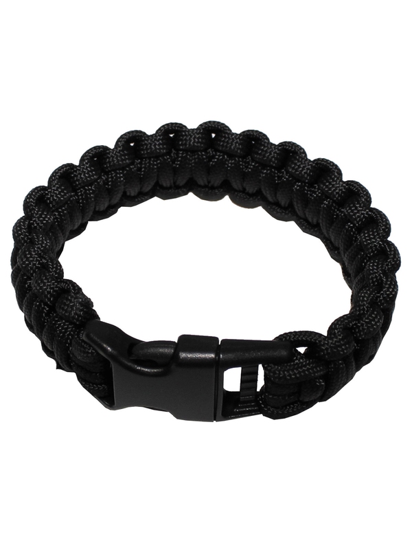 Profesionálny náramok na ruku z pletené paracord - "Paracord" v čiernej farbe, šírka 2.3 cm s klipom na uzatvorenie. Veľkosti: S = 18 cm, L = 20 cm, L = 22 cm, dĺžka otvorené: S = 280 cm, L = 300 cm, L = 330 cm. Materiál: 100% polyester. | ||