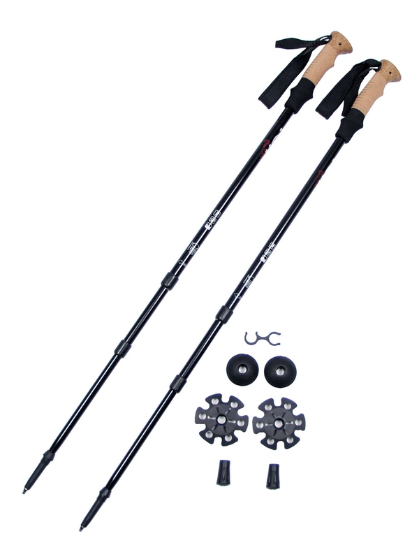 Teleskopické pevné trekingové paličky trojdielne, lisované s nylonovým opaskom na uchytenie hole, kovový hrot s ochranným krytom a dva ďalšie vymeniteľné rôzne taniere, taška s nastaviteľným ramenným popruhom. Dĺžka: 70 cm zatvorené, rozpätie 135 cm.