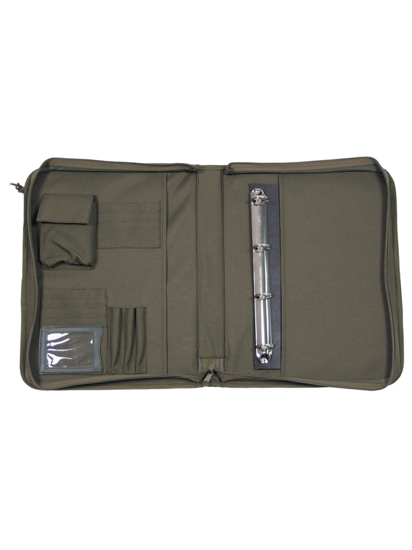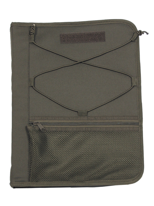 Maskovacie písacie podložka A4, v olivovej farbe, obal na papiere, vrecko na mapu, má register listov, tri vrecká na perá, vrecko na napájací zdroj, vnútorné vrecko so zapínaním na suchý zips, sedem vreciek vo vnútri, na vonkajšej strane štítok suchým zipsom pre menovky. Materiál: 100% polyester.