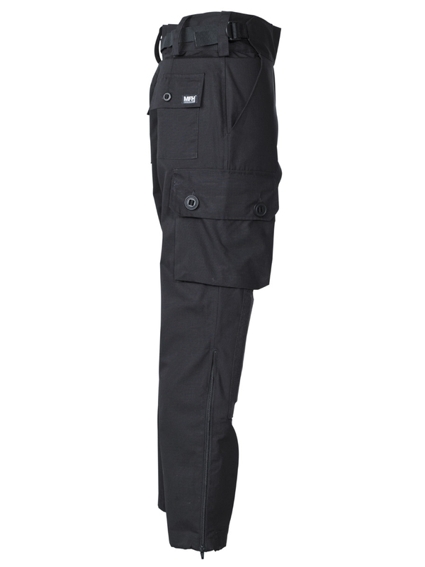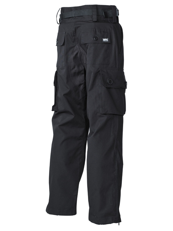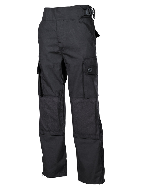 Komando nohavice "Smock", Rip Stop, čierne. Majú dve bočné vrecká, dve zadné s klopou, dve bočné so suchým zipsom našité na stehnách, sedacie výstuže, vystužená kolená s odnímateľným polstrovaním a široký nastaviteľný pás na suchý zips, bočné zipsy na nohaviciach a uťahovacie pásky v nohaviciach. Materiál: 65% polyester, 35% bavlna.