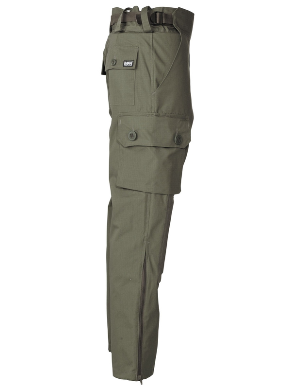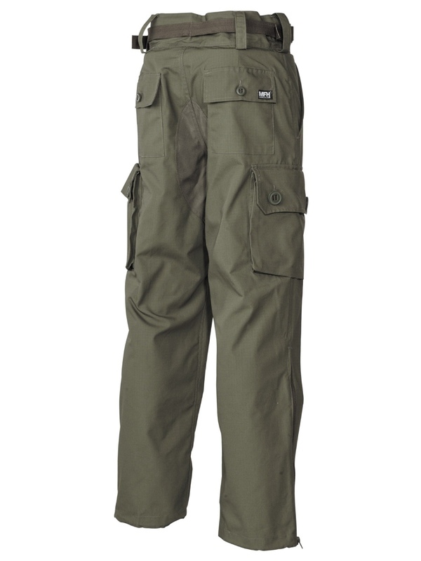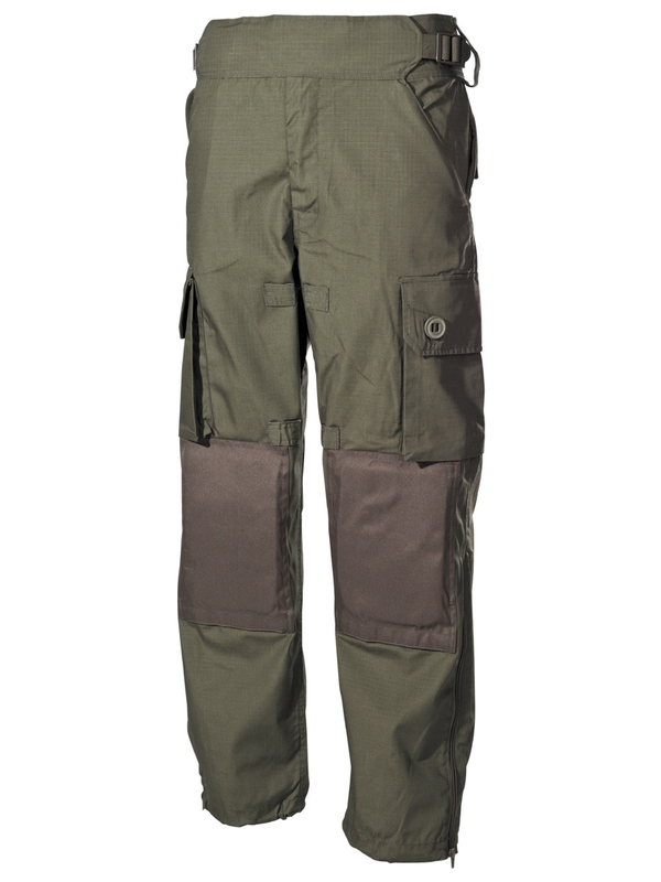 Komando nohavice "Smock", Rip Stop, olivové. Majú dve bočné vrecká, dve zadné s klopou, dve bočné so suchým zipsom našité na stehnách, sedacie výstuže, vystužená kolená s odnímateľným polstrovaním a široký nastaviteľný pás na suchý zips, bočné zipsy na nohaviciach a uťahovacie pásky v nohaviciach. Materiál: 65% polyester, 35% bavlna.