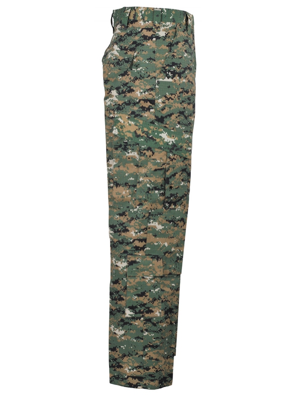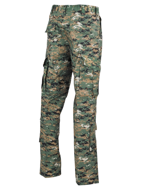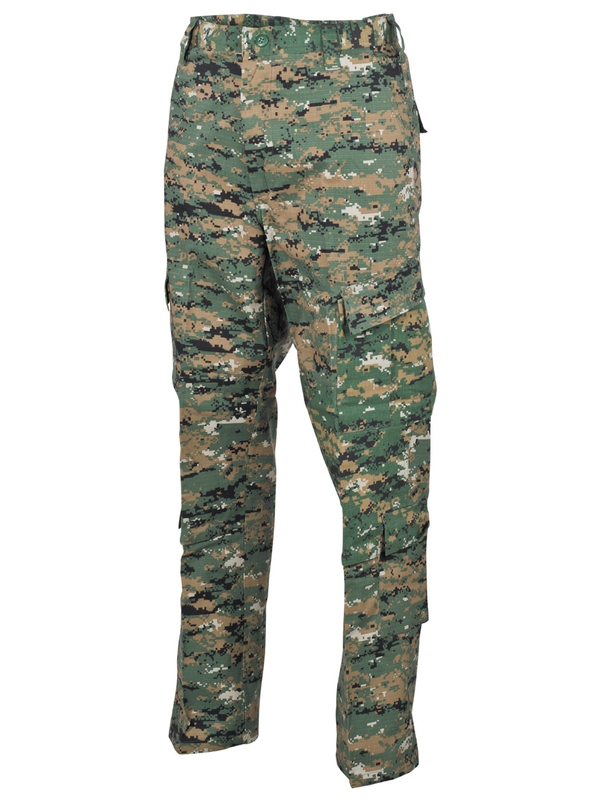 Nohavice US ACU RIP STOP, 2 zadné vrecká, 2 predné, 4 bočné vrecká, dvojitá látka na kolenách a na sedacej časti, sťahovacie pásky na boku, 65% Polyester, 35% bavlna. V úprave woodland - digital. maskovanie.