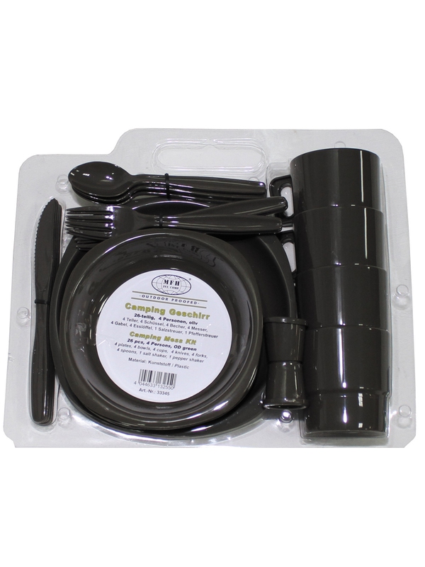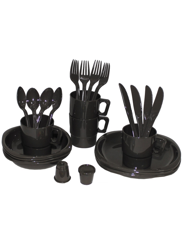 Campingová plastová súprava riadu, 26 ks, olivová, 4 taniere, 4 misky, 4 šálky, 4 nože, 4 vidličky, 4 lyžice, soľnička, korenička. Materiál: plast | ||