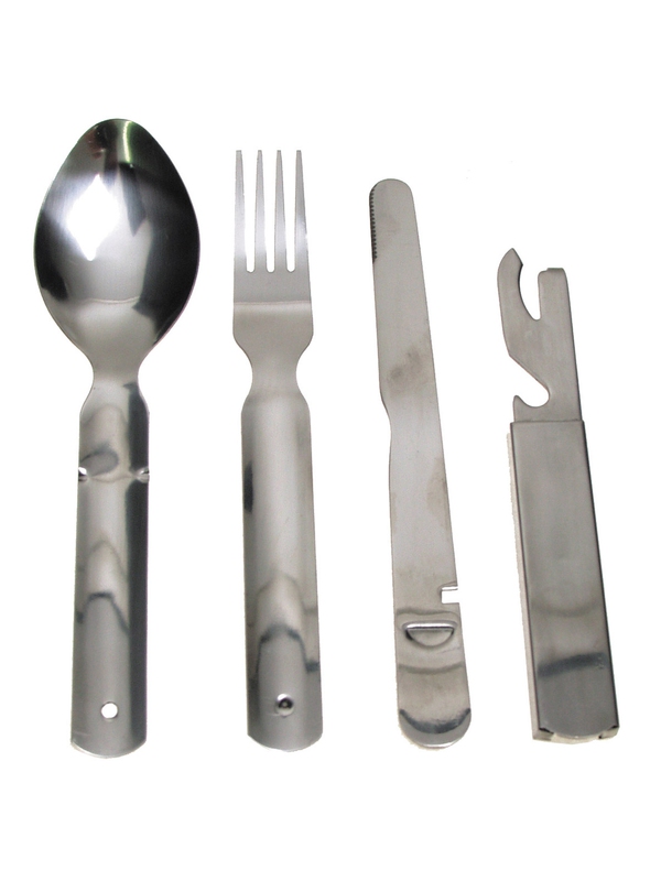Kópia príboru používaného v armáde Bundeswehru. Komplet je vyrobený z nerez ocele a obsahuje štyri časti - nôž, vidličku, lyžicu a držiak, ktorý je zároveň prispôsobený na otváranie konzerv a korunkových uzáverov na fľašiach. Pri preprave alebo balení do batožiny sa komplet pomocou držiaka scvakne dohromady, čím zaberá minimum miesta a nehrozí strata žiadne súčasti príboru. Materiál: kov - nerez. Rozmery: celková dĺžka 195 mm, šírka rukovätí 20 mm, šírka lyžice 50 mm. Hmotnosť: 200 g | ||