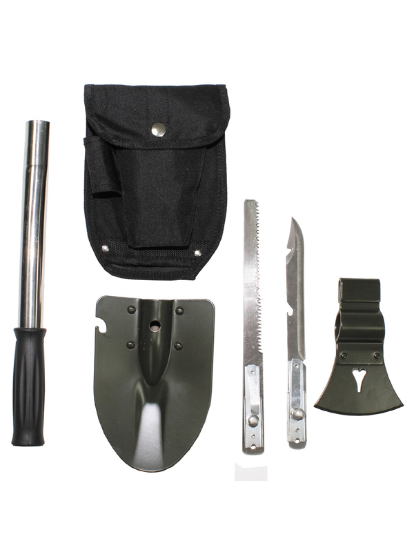 Multifunkčná šesťdielna sada náradia s taškou sa skladá z univerzálnej rukoväte na sekeru, rýľ, pílu, otvárač s nožom a puzdro. | ||