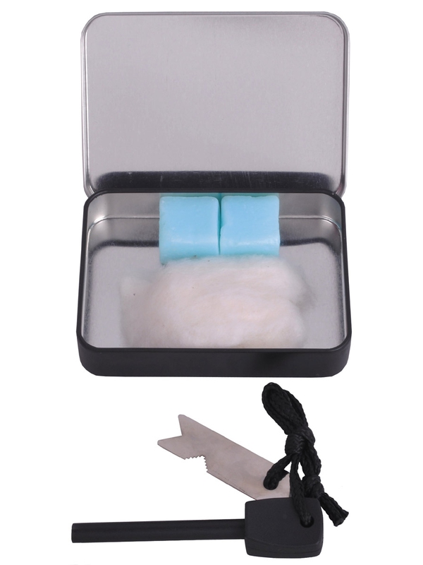 Křesadlový set. Plechová krabička obsahuje kresadlo, ktoré je spojené s plieškom. Po prejdení plieškom po oceľovej tyčke odlietavajú iskry, ktoré zapáli pripravené podložie pre oheň. Ďalšou súčasťou sú 2 horľavé tablety a vata. | ||
