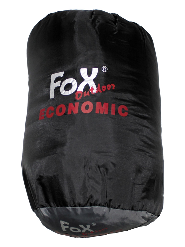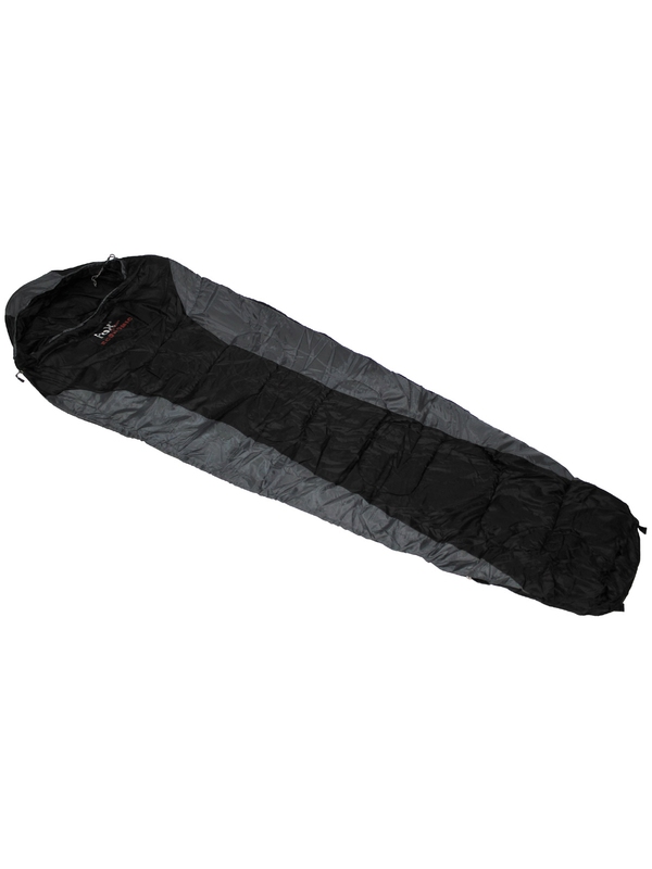 Spací vak múmia "ECONOMIC" čierno / šedý s kompresným obalom. Spacák do teploty: -4 ° C - 18 ° C. Materiál: Shell: 100% polyester 190T, podšívka: 210T mikrovlákno, náplň: 250g / m polyesterové duté vlákna. Veľkosť: 220 x 80 x 55 cm.