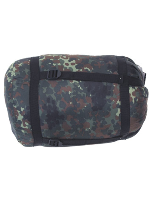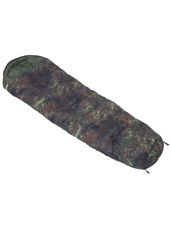 Múmia spacák v dizajne flecktarn, s polyesterovou výplňou 450g/qm, 2LG. Dvojvrstvový spacák s hlavou má hmotnosť: 195 g, rozmery: 220 x 50 x 75 cm, veľkosť balenia: dĺžka 40 cm, priemer 25 cm, materiál: 100% polyester, podšívka: 100% bavlna, Náplň: 2 x 225 g / m² dutých vlákien / polyester.
