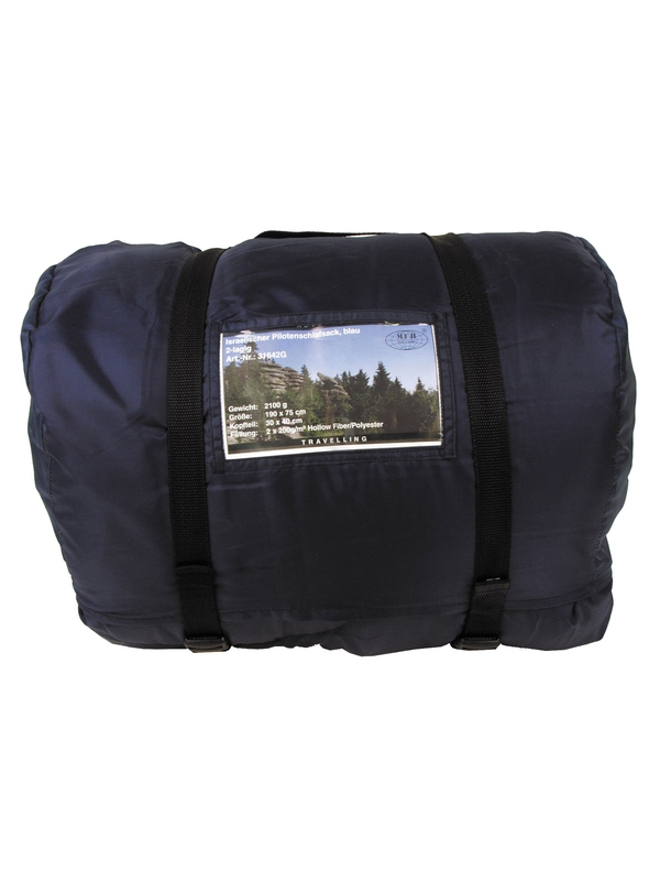 Izraelský pilotný spacák, v modrej farbe. Dvojvrstvový spacák, váha: 1800 g, rozmery: 190 x 75 cm, čelo: 30 x 40 cm, veľkosť balenia: dĺžka 40 cm, priemer 25 cm, materiál: 100% polyester, podšívka: 100% bavlna, náplň: 2 x 200 g / m² dutých vlákien / polyester.